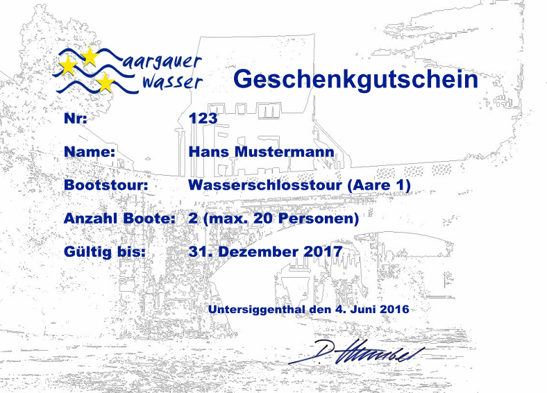 Möchten Sie jemandem eine Freude machen und ein unvergessliches Erlebnis bereiten, dann ist ein Geschenkgutschein von aargauerwasser genau das Richtige für Sie. Eine Bootsfahrt kommt immer an, sei es zum Geburtstag, zur Hochzeit, zum Jubiläum, für die bestandene Prüfung oder einfach nur so. Überraschen Sie Ihre Lieben mit einer geführten Bootstour auf der Aare, der Reuss, der Limmat oder dem Rhein. Sie bestimmen die Tour und die Anzahl Boote. Beides kann natürlich durch einen entsprechenden Kostenausgleich nach oben erweitert werden. Das Datum ist während der Gültigkeitsdauer frei wählbar (freie Kapazität vorausgesetzt).