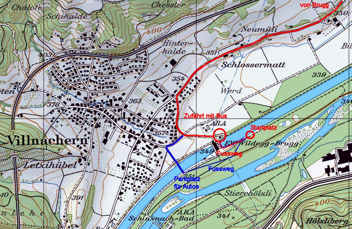 Der Startplatz befindet sich ca. 200m unterhalb des Kraftwerkes Villnachern, auf der rechten Kanalseite. Koordinaten: N47.4693 E8.1723